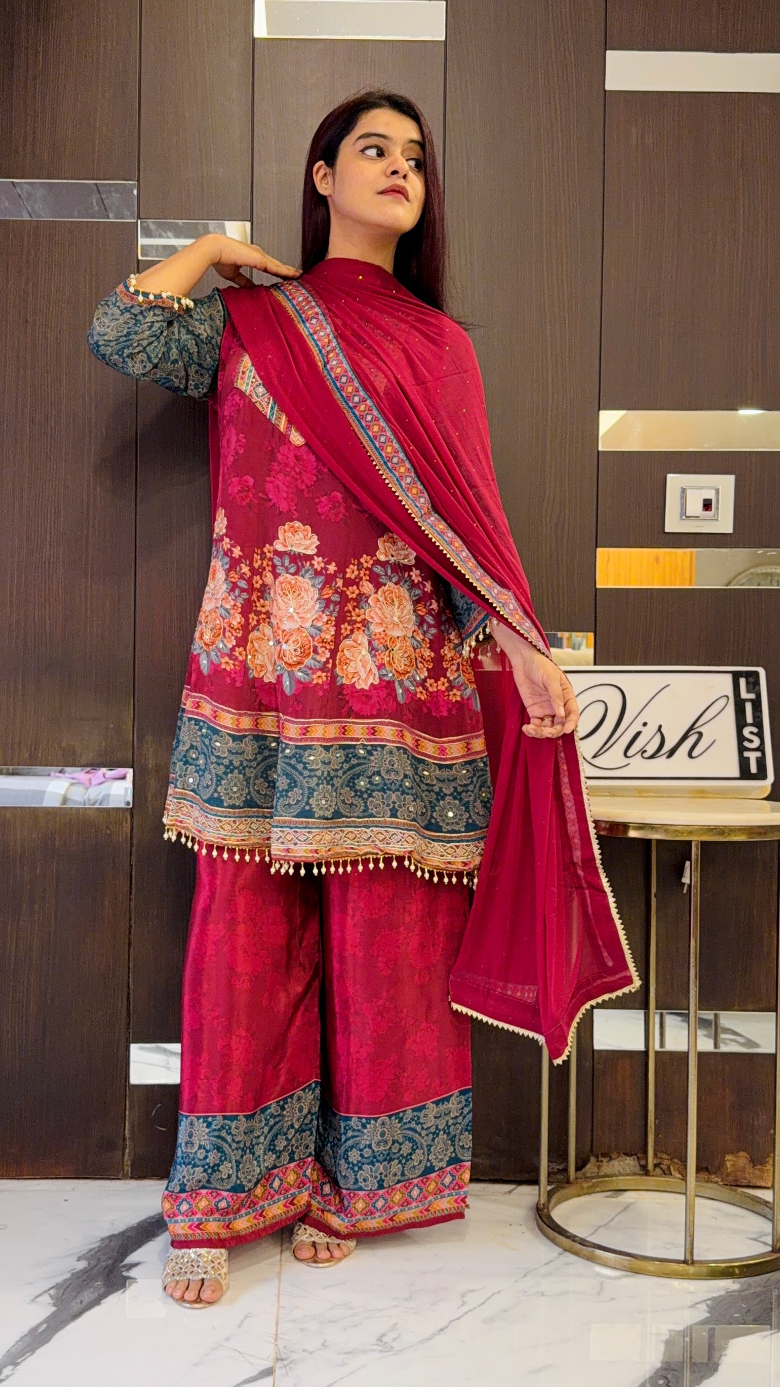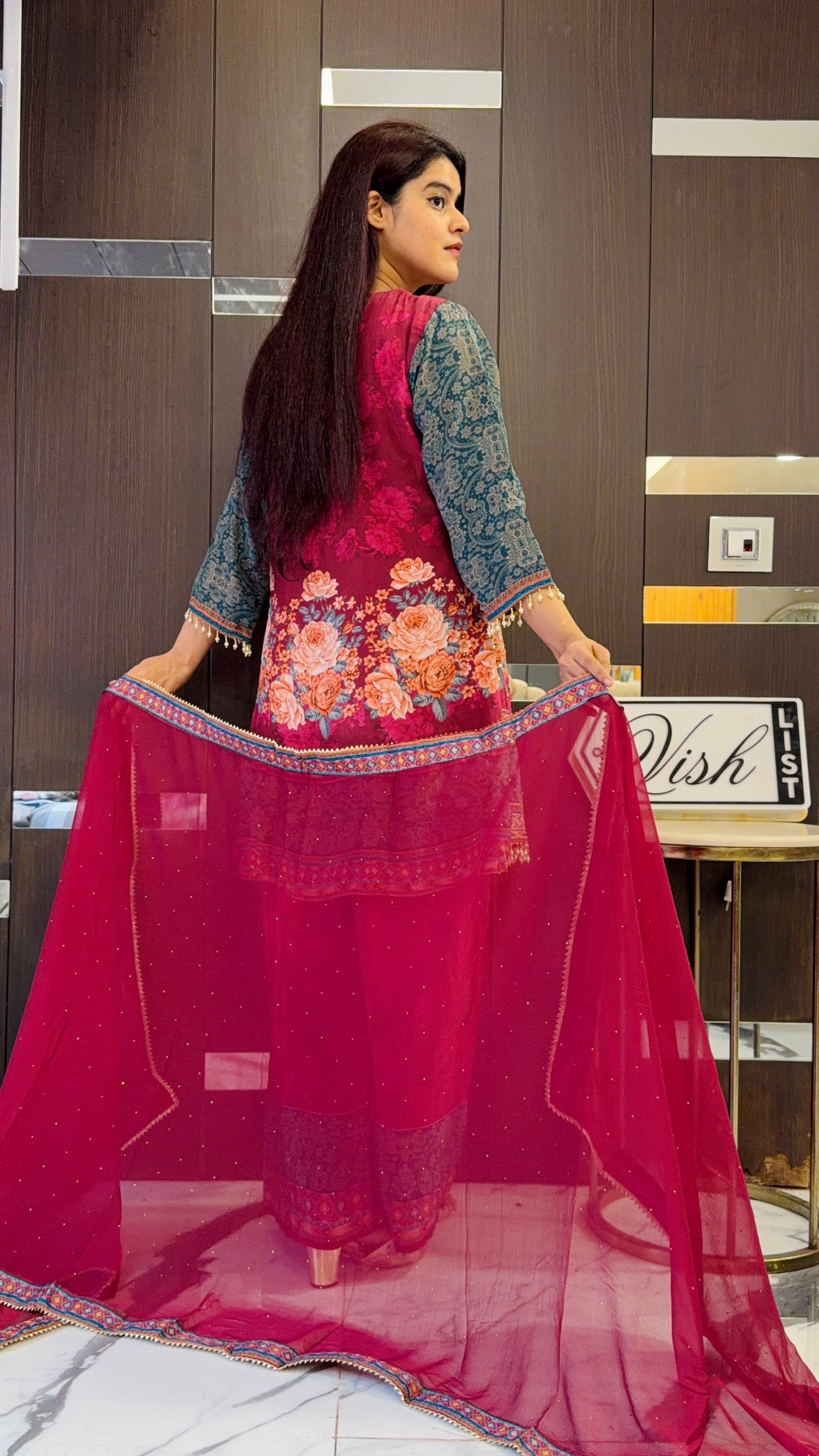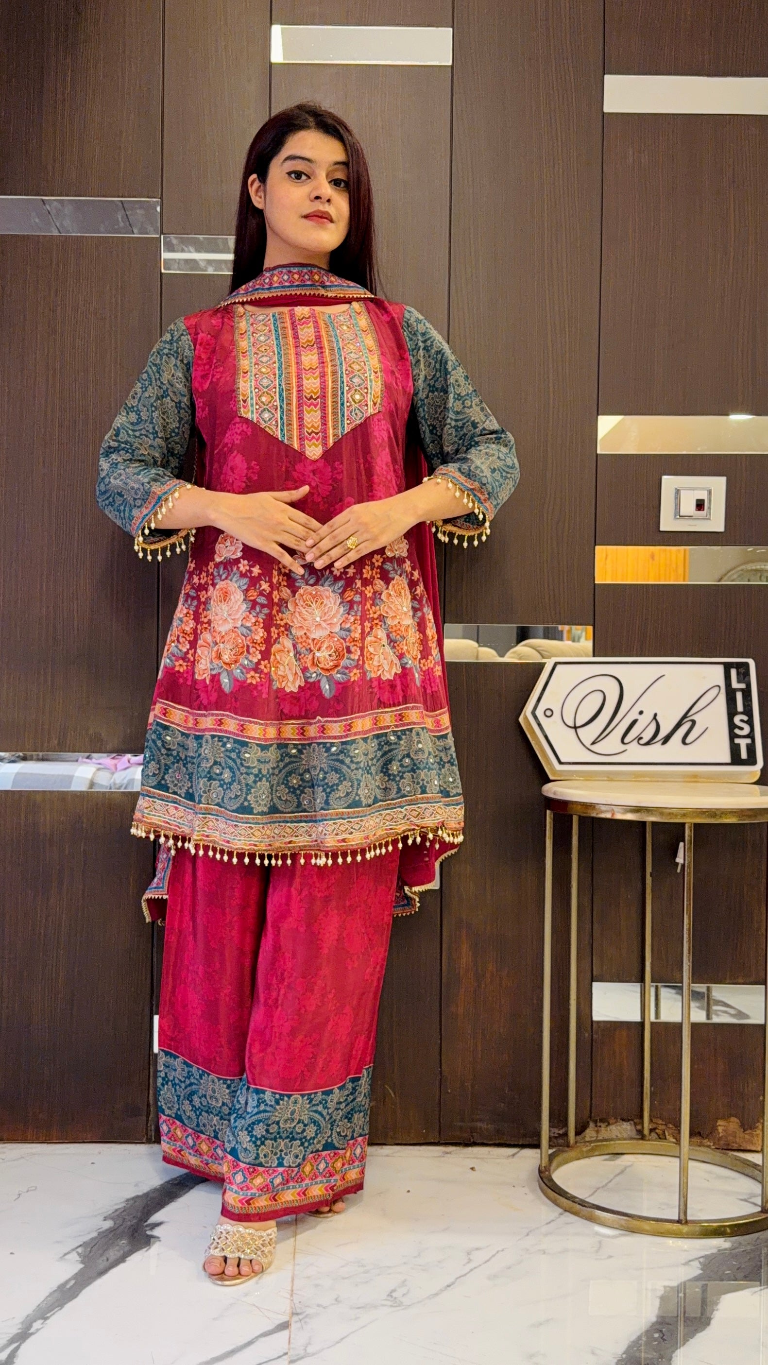 Introducing Vishlist's Diwali Collection - Bahara Pakistani Formal Sets. Handcrafted with premium Imported american crepe fabric, this multi-coloured set features exquisite gota patti and original mirror work detailing and embroidery, accented with beadwork latkans. Perfect for the festive season!