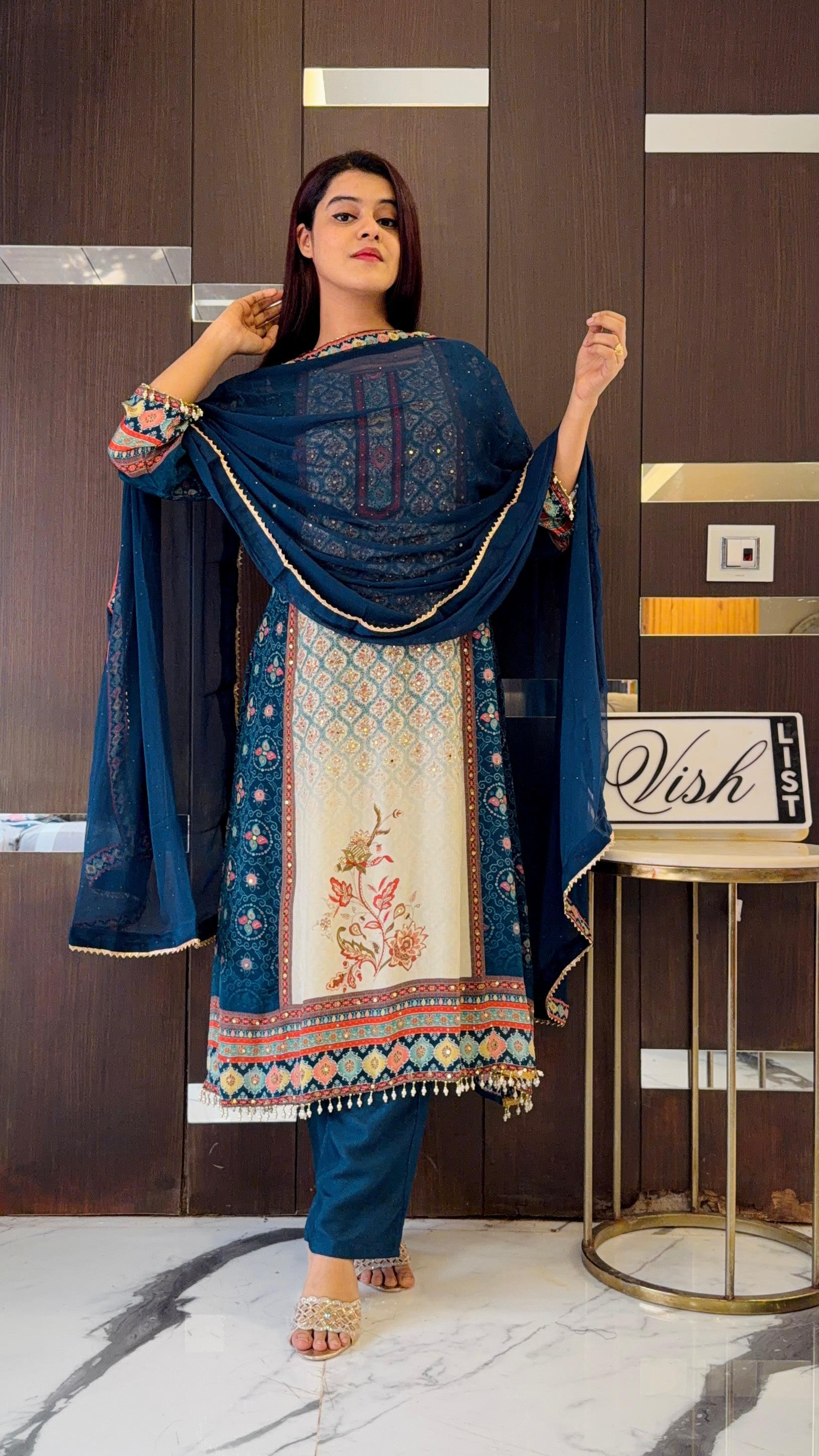 Introducing Vishlist's Diwali Collection - Bahara Pakistani Formal Sets. Handcrafted with premium Imported american crepe fabric, this multi-coloured set features exquisite gota patti and original mirror work detailing and embroidery, accented with beadwork latkans. Perfect for the festive season!