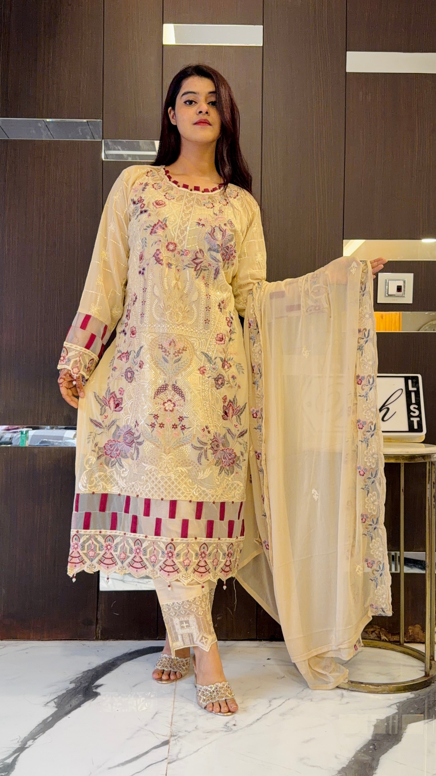 Get ready to make a statement with the Firdous Pakistani Formal Set. This fully stitched ensemble features intricate embroidery on pure Georgette fabric, paired with georgette embroidered dupatta, offering the perfect balance of comfort and style. Perfect for wedding wear, this set is a must-have for any fashion-forward individual!