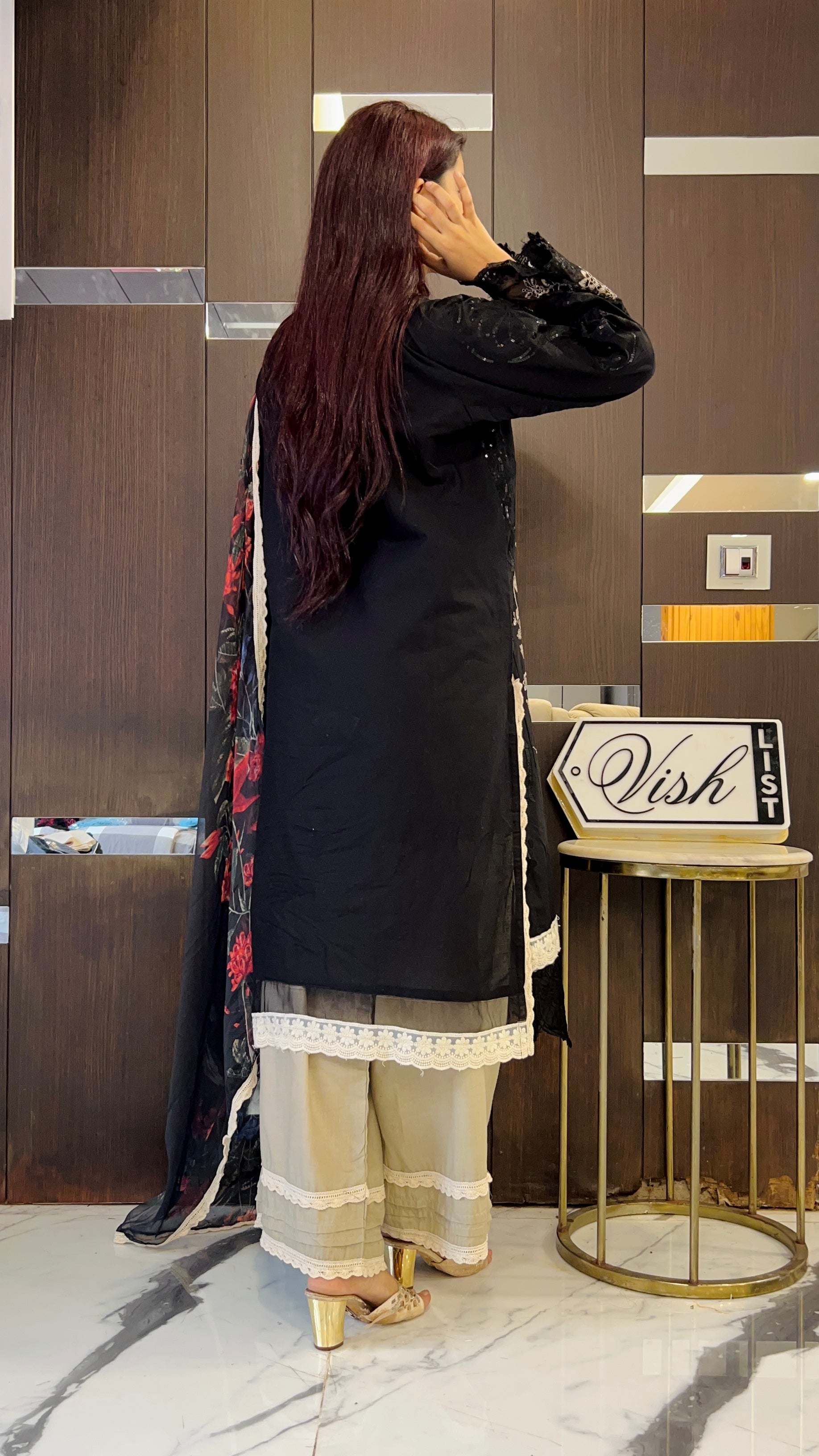 Get ready to make a statement this festive season with our Hafza Pakistan Luxe Lawn Set! This fully stitched formal Pakistani lawn set features exquisite embroidery and cutwork all over, with beautiful detailing to the sleeves and neckline. Complete the look with the beautiful floral dupatta with lace embellishments and wide palazzo pants. Stand out in style and comfort!