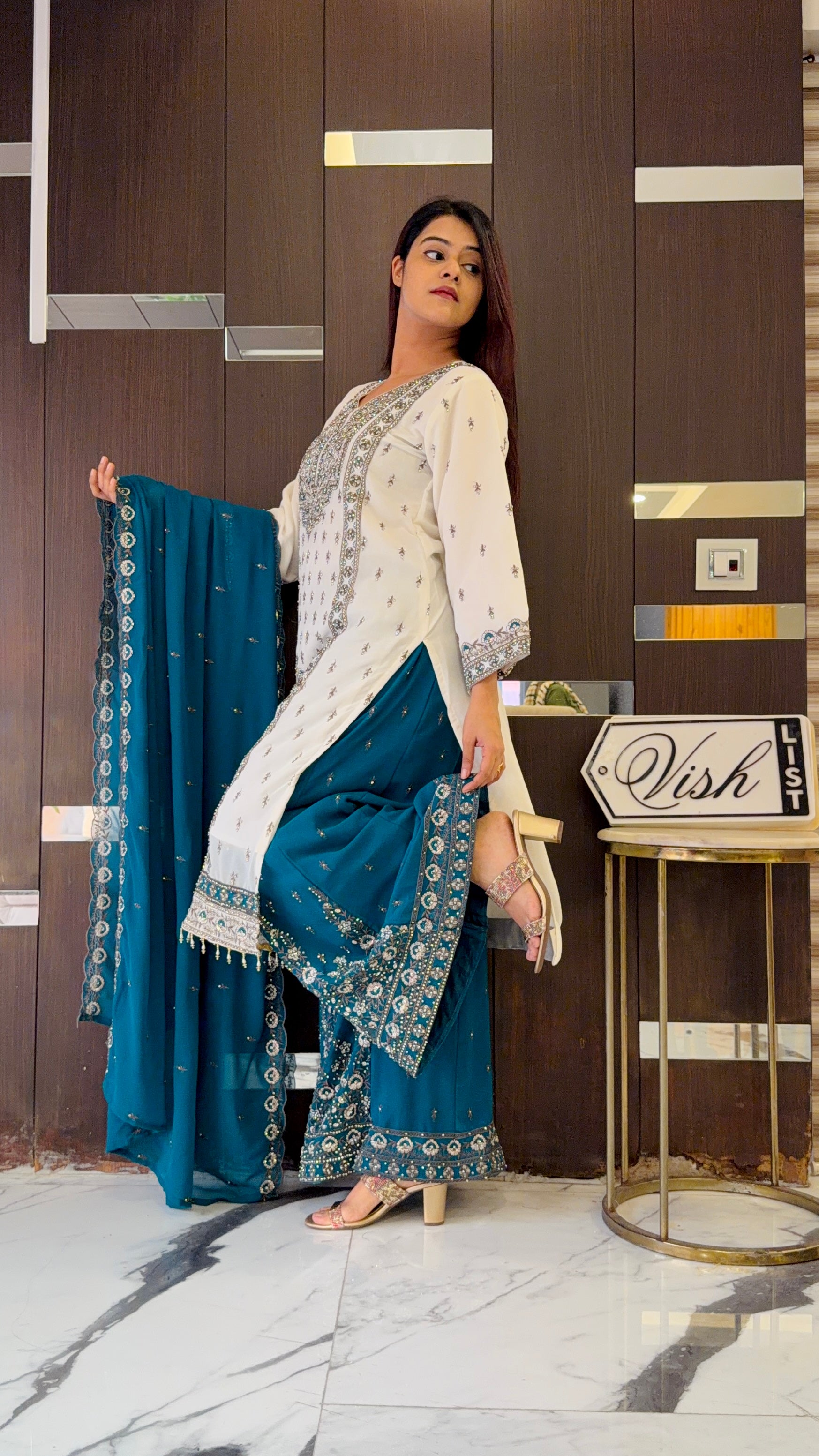 Step up your style game with the Hayat Pakistani Formal Set! This fully stitched delight, crafted from georgette fabric, features hand-embroidered beadwork all over. Paired with beautiful flared sharara pant and an embellished dupatta—perfect for turning heads at Eid! (Just don’t forget to twirl!)