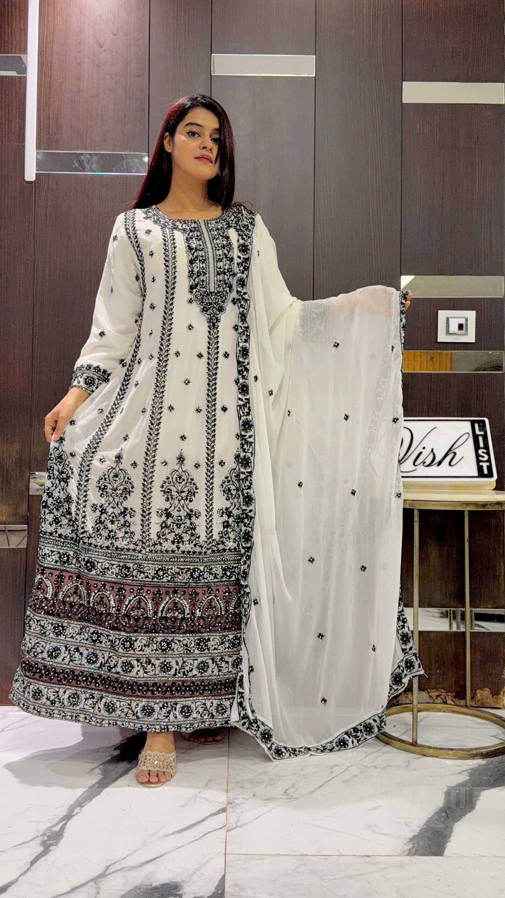 Look absolutely stunning in our Zafrah Pakistani Wedding Wear! This fully stitched, ready to wear wedding wear is adorned with intricate beadwork and made of pure Georgette fabric. Complete with a gown, pant, and dupatta, this 3 piece set will make you stand out at any formal event.