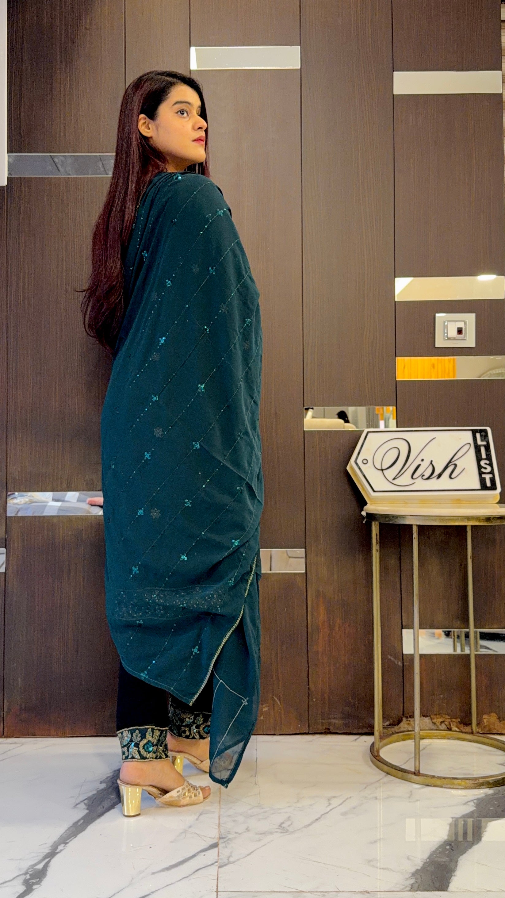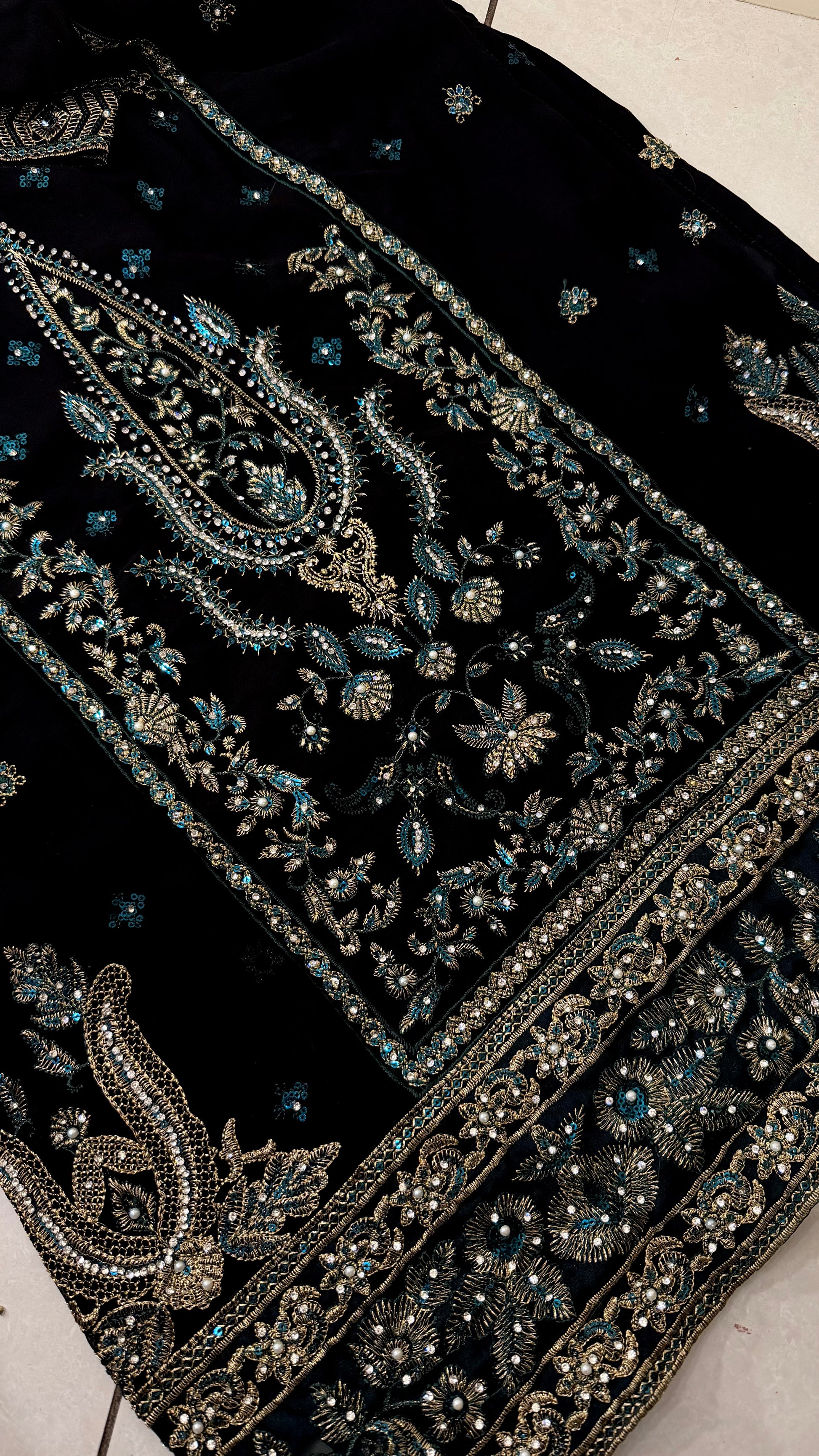 Look absolutely stunning in our Zafrah Pakistani Wedding Wear! This fully stitched, ready to wear wedding wear is adorned with intricate beadwork and made of pure georgette fabric. Complete with Kurta, pant, and dupatta, this 3 piece set will make you stand out at any formal event.