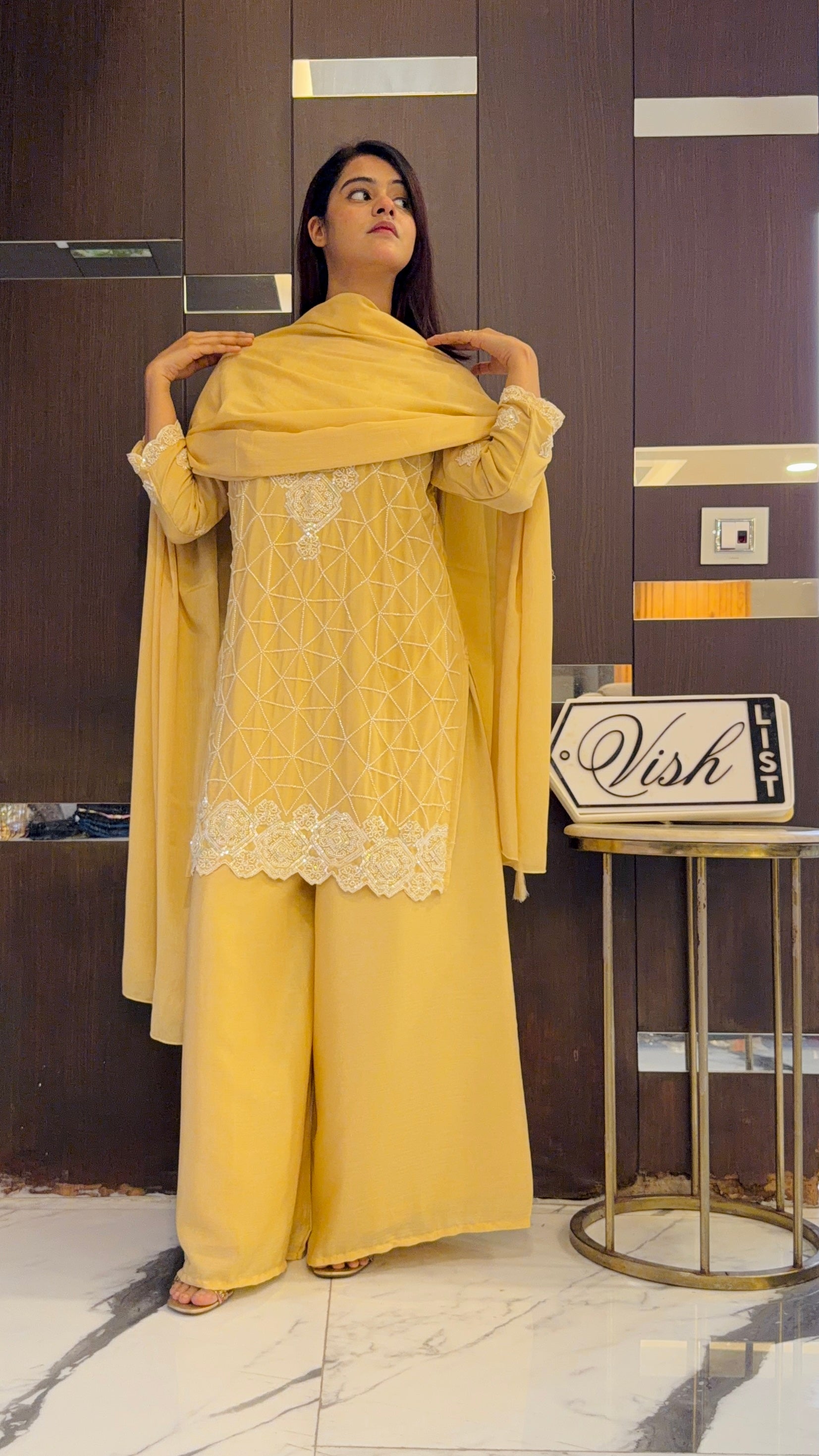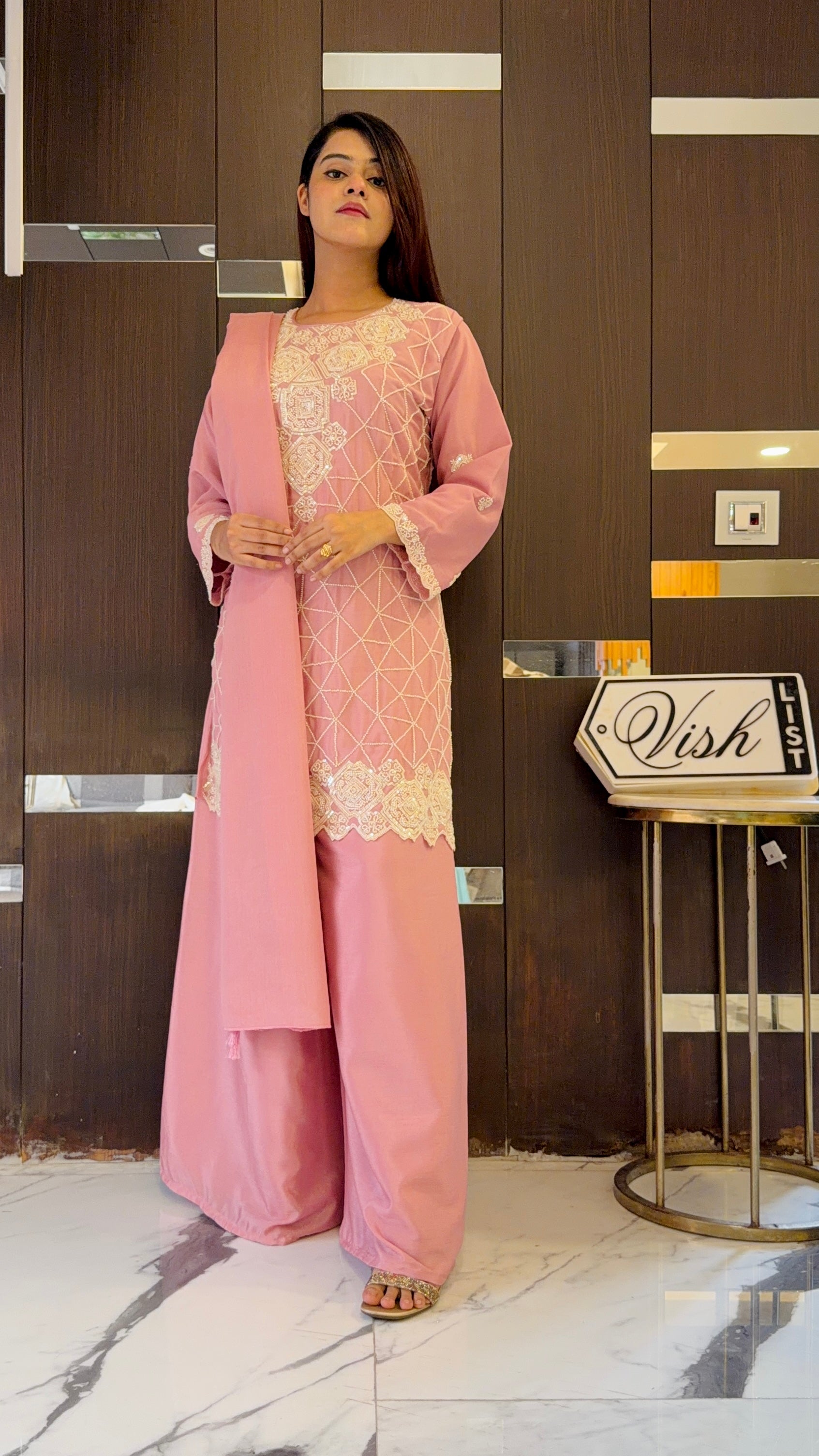 The Zifra Pakistani Formal Set features a fully stitched flared palazzo design, enhanced by intricate handwork embroidery and cutwork detailing. Constructed from soft pure georgette fabric, it offers exceptional quality, comfort, and elegance, making it suitable for formal occasions where style and sophistication are paramount.