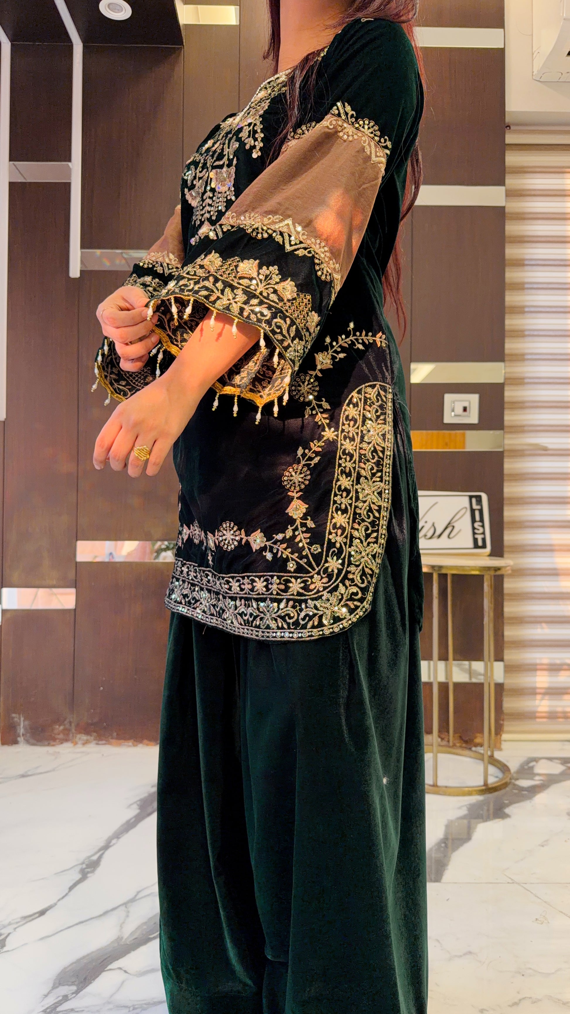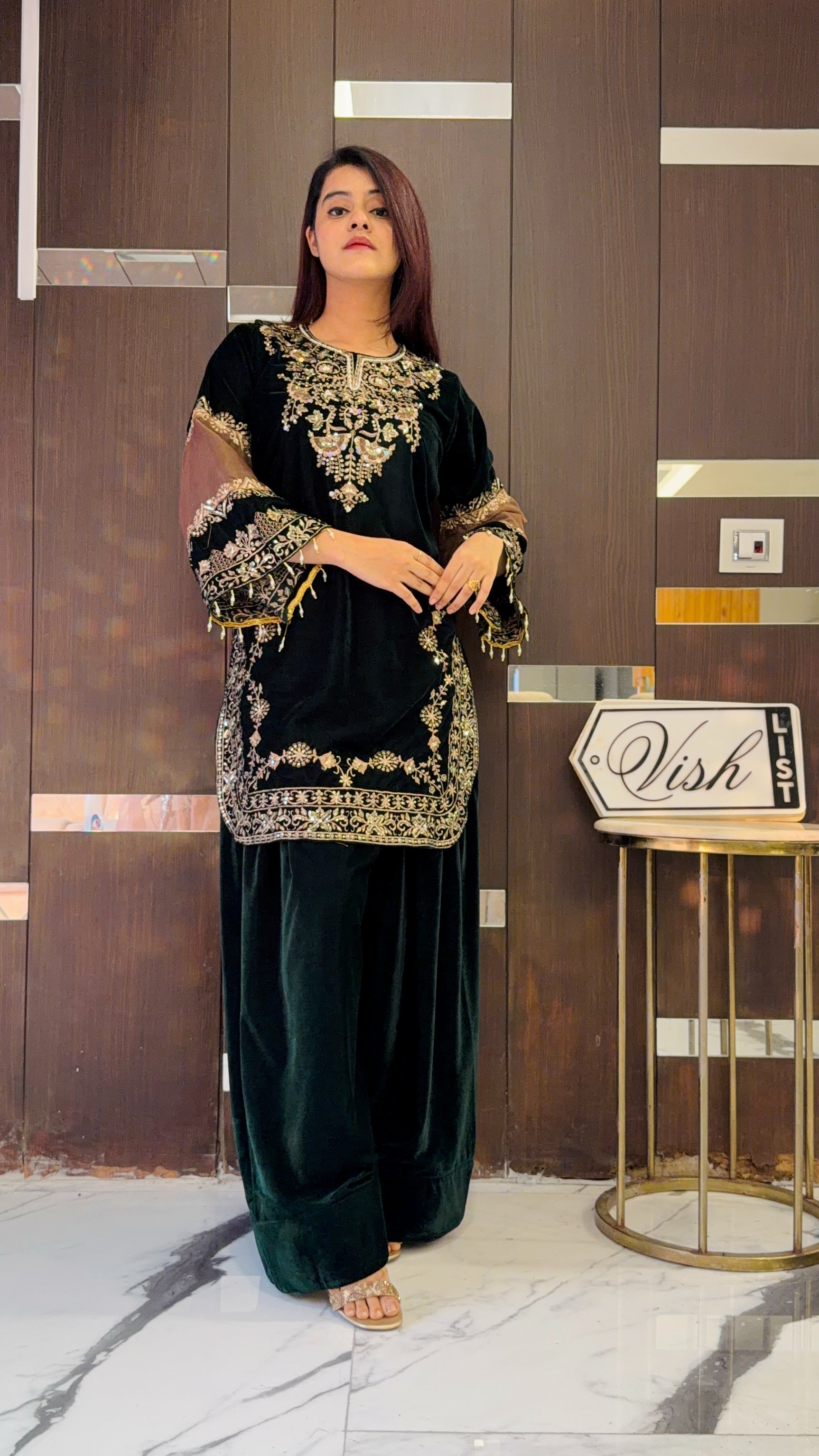 Inspired by Sonal Chauhan, this fully stitched Velvet Farshi Salwar Suit is a perfect pick for the upcoming Eid! Made of imported velvet fabric and embellished with intricate embroidery, it’s one of a kind! Paired with a beautiful contrast organza dupatta. ✨
